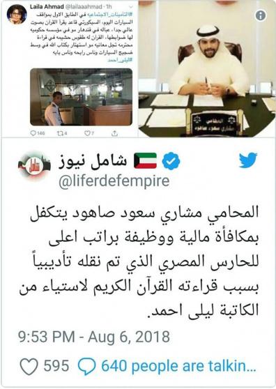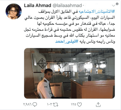 موجة انتقادات واسعة لاقتها الكاتبة الكويتية ليلى أحمد بعد نشرها على موقع التواصل الاجتماعي تويتر تغريدة تنتقد فيها عاملاً مصرياً وهو يقرأ القرآن بصوت مرتفع أثناء ساعات عمله في حراسة موقف للسيارات.
