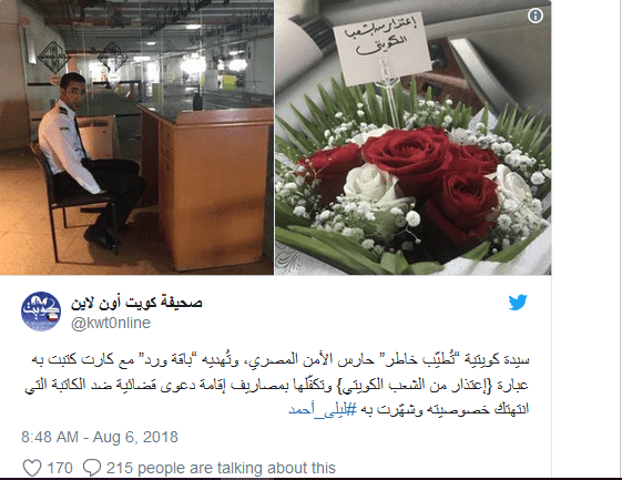 وتداول النشطاء صورة لباقة ورد كتب عليها بطاقة اعتذار من الشعب الكويتي، وقيل إنها مقدمة من سيدة كويتية إلى الموظف كاعتذار عما تعرض له من تشهير، متكفلةً بمصاريف أي دعوى قضائية يرفعها الوافد ضد الكاتبة.
