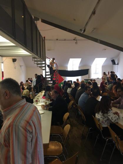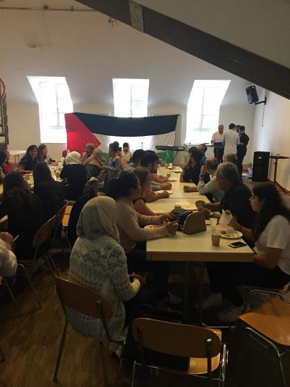 وفي جو عائلي توافدت عشرات العائلات والطلبة والشباب الجدد لاحياء هذه المناسبة، بعد كلمة قصيرة من رئيس الجالية ابو طارق رحب فيها بالحضور وقدم التهنئة بمناسبة العيد وتمنى أن يعود علينا عيد الأضحى المبارك وقد تحققت آمال شعبنا بالحرية والعودة والاستقلال وتسود العدالة الاجتماعية لشعوبنا العربية.