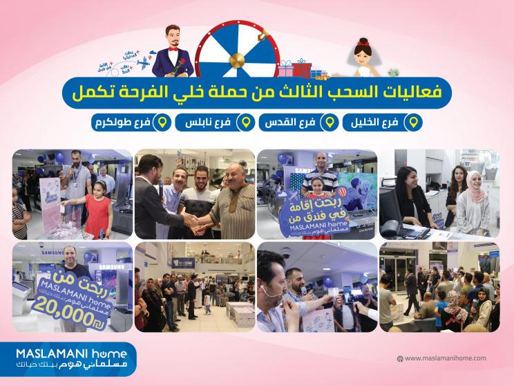 أعلنت شركة مسلماني هوم عن أسماء الفائزين بالسحب الثالث ضِمن حملة "خلي الفرحة تكمل"، وشملت الجوائز 40000 شيكل كاش ورحلتي شهر عسل إلى تركيا وإقامتين في أفخم فنادق فلسطين، ووُزعت الجوائز على سبعة فائزين في معارض مسلماني هوم، حيث فاز بـ 20,000 شيكل كاش فواز محمد حمزة من طولكرم، وبـ 10,000 شيكل كاش إيهاب مجدي طباخي من الخليل، وبـ 10,000 شيكل كاش مصطفى محمد أبو عواد من الخليل، وفاز برحلتي شهر عسل إلى تركيا كل من صفوت رافع زيدات ويوسف إبراهيم القواسمة من الخليل، وفاز في إقامتين في فندق كل من مهند محمد شلبي وفيصل إبراهيم صباح من طولكرم.