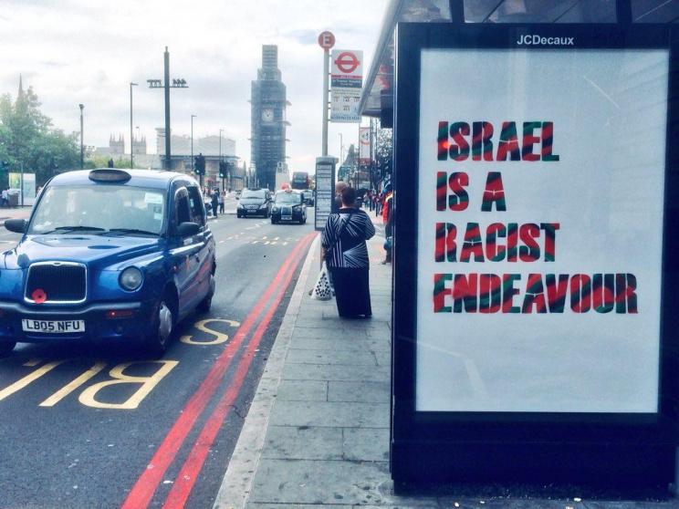 وجاءت الملصقات بالحجم الكبير، والتي ظهرت بحروف مطبوعة باللون الأخضر، الأحمر، والأسود التي ترمز للعلم الوطني الفلسطيني كتب عليها "إسرائيل محاولة عنصرية"، تم تلصيقها على المساحات الإعلانية الموجودة في محطات الحافلات في وسط لندن بما في ذلك تلك الموجودة في وستمنستر وجسر واترلو.