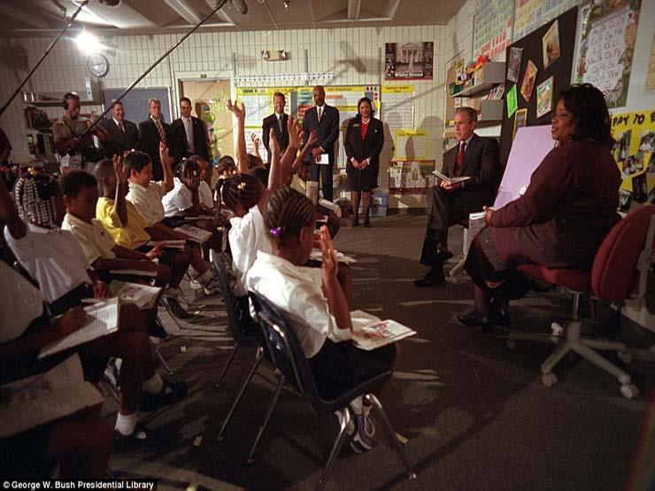وتكشف الصور أن الرئيس الأمريكي كان يشارك في عرض للقراءة مع أطفال في مدرسة "إيما إي بوكر" الابتدائية في ساراسوتا بولاية فلوريدا، في لحظة وقوع الهجم الأول على برج التجارة الشمالي.