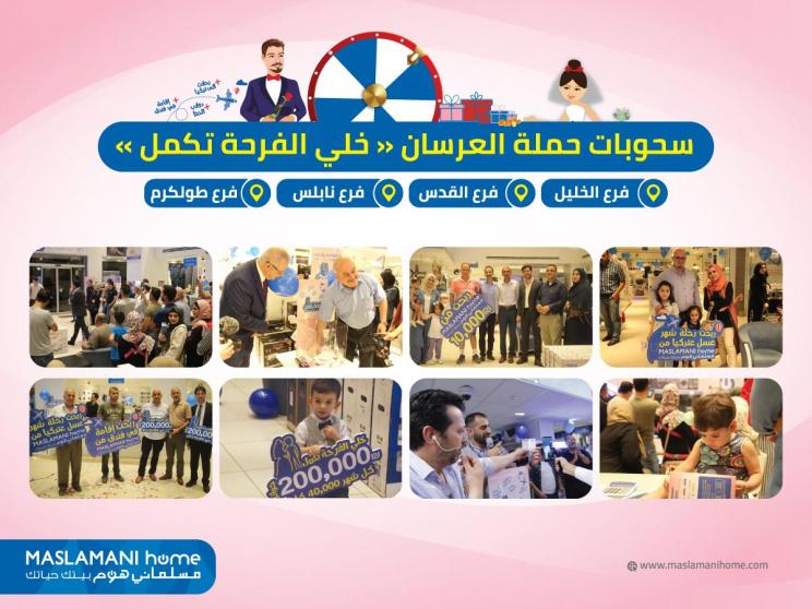 احتفلت شبكة معارض مسلماني هوم باختتام حملة العرسان الأضخم "خلي الفرحة تكمل" والتي وُزع من خلالها جوائز بقيمة 200,000 شيكل كانت من نصيب 21 فائزاً في أربعة معارض خلال فترة الحملة التي استمرت لمُدة 3 شهور، إضافة لجوائز دولاب الحظ والعديد من الجوائز العينية القيّمة ومُسابقات وأجواء من الفرح والسعادة سادت معارض مسلماني هوم أثناء فعاليات السحب.