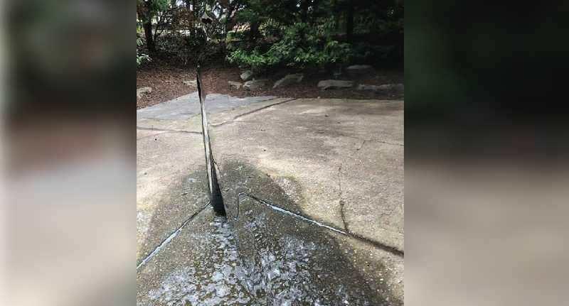 النظرة الأولى للصورة لا يظهر فيها إلا بعض الأشجار والأحجار ومياه على الأسفلت.