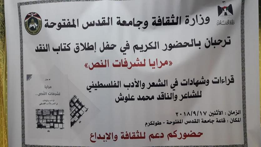 نظمت وزارة الثقافة في محافظة طولكرم بالتعاون مع جامعة القدس المفتوحة حفل إطلاق كتاب النقد " مرايا لشرفات النص" ـ قراءات وشهادات في الشعر والأدب الفلسطيني للشاعر والناقد محمد علوش ، تحدث فيها بالنقد والتحليل كل من الشاعر الفلسطيني المقيم بالأردن محمد دلة ود. سناء تايه ود. محمود صبري ، بحضور: منتصر الكم مدير مكتب وزارة الثقافة ود. سلامة سالم مدير جامعة القدس المفتوحة ـ فرع طولكرم ، وأعضاء المجلس الاستشاري الثقافي ونخبة من المثقفين والأدباء والكتاب والمهتمين بالحراك الثقافي ، وممثلين عن المؤسسات الأهلية والرسمية وفصائل العمل الوطني.