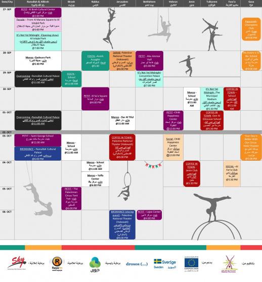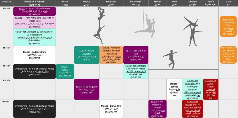 تحت عنوان "متحدون للحرية"، ينطلق مهرجان سيرك فلسطين هذا العام في الــــــ27 من أيلول الجاري، ويستمر حتى 6 تشرين أول المقبل، مستضيفاً فرق سيرك محلية وأخرى دولية من فرنسا، وبريطانيا، وتشيلي، والأرجنتين، في اثني عشر عرضاً يتجولون في اثنين وثلاثين موقعاً في أنحاء فلسطين؛ في القدس، ورام الله، والبيرة، ونابلس، والخليل، وبيت لحم، وجنين، وطولكرم، وبيرزيت، وغزة، ومخيمات اللاجئين، وعمان.
