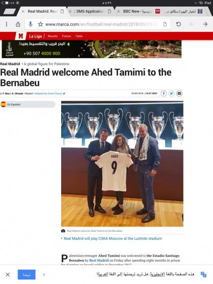 استقبل نادي ريال مدريد الاسباني وبطل دوري ابطال اوروبا الفتاة عهد التميمي، الأسيرة السابقة في سجون الاحتلال، والتي تحولت لأيقونة المقاومة الشعبية الفلسطينية ضد الاحتلال.