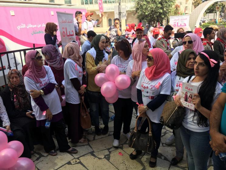 لمناسبة الأول من تشرين الأول أطلقت مؤسسة لجان العمل الصحي/ دنيا المركز التخصصي لأورام النساء وبنك فلسطين بالتنسيق مع محافظة الخليل وبلدية الخليل الحملة العربية للتوعية عن سرطان الثدي تحت شعار " الكشف المبكر... حياة" بمشاركة عدد كبير من مؤسسات وفعاليات الخليل إلى جانب النساء التي وصلن إلى دوار بن رشد وسط الخليل والذي جرى تززينه باللافتات التي تدعو النساء للمسارعة للكشف المبكر إلى جانب البالونات زهرية اللون الشعار المتعارف عليه عالمياً.
