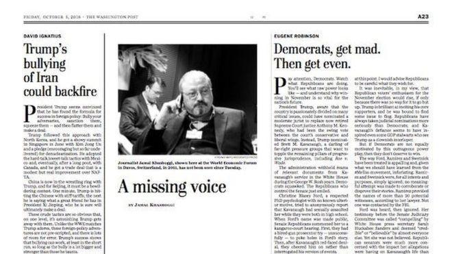 تركت صحيفة واشنطن بوست عمودا فارغا في نسختيها الورقية والإلكترونية دعما للصحفي السعودي، جمال خاشقجي، الذي اعتاد أن يكتب مقالات للرأي في الصحيفة.