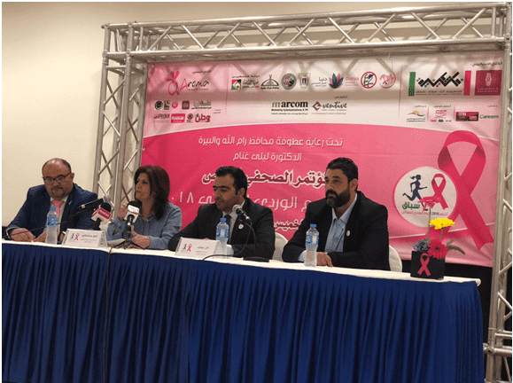 نظمت مؤسسة لجان العمل الصحي/ دنيا المركز التخصصي لأورام النساء وشركة إيفنتف للعلاقات العامة وشركة ماركوم للخدمات والعلاقات العامة وبنك فلسطين مؤتمراً صحفي للإعلان عن موعد السباق الوردي النسائي في نسخته الثالثة وذلك ضمن فعاليات شهر التوعية عن سرطان الثدي والتي إنطلقت أوائل الشهر الجاري تحت شعار "الكشف المبكر .. حياة" وذلك بحضور الرعاة والداعمين للسباق.