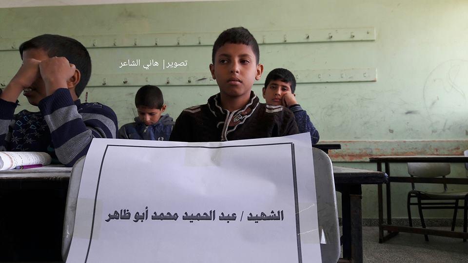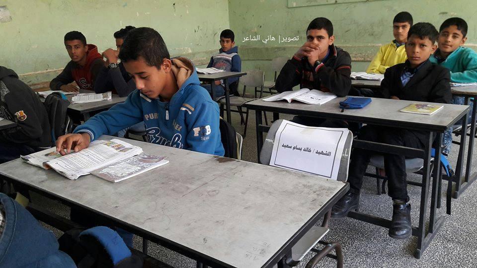 الحزن والغضب الشديدين خيّم على وجوه زملاء الشهداء في مدرسة بلال بن رباح الأساسية في مديرية تعليم الوسطى، ورفعوا صور الشهداء، كما وضعوا صورهم على مقاعد الدراسة، التي توشحت بالسواد على فراقهم.