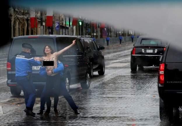 وأثناء مرور موكب ترامب في شارع الشانزليزيه متجها إلى قوس النصر، ركضت محتجة "عارية الصدر" من منظمة (فيمين) المدافعة عن حقوق المرأة صوب الموكب لتصل إلى مسافة بضعة أمتار فقط قبل أن تلقي الشرطة القبض عليها.