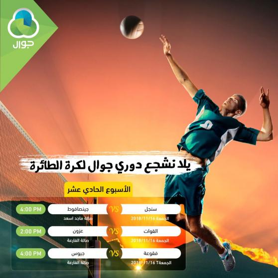أعلن الاتحاد الفلسطيني لكرة الطائرة عن جدول مباريات الاسبوع الحادي عشر من دوري جوال لكرة الطائرة في المحافظات الشمالية وفقاً للجدول التالي: