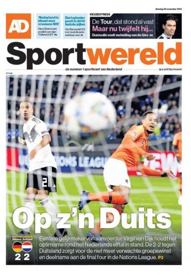 احتفلت الصحف الهولندية بالإنجاز الذى حققه المنتخب البرتقالي بالتعادل الإيجابي مع مضيفه الألماني بهدفين لكل منهما، وتأهل منتخب الطواحين إلى نصف نهائي دوري أمم أوروبا.