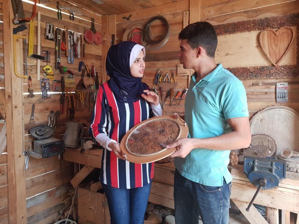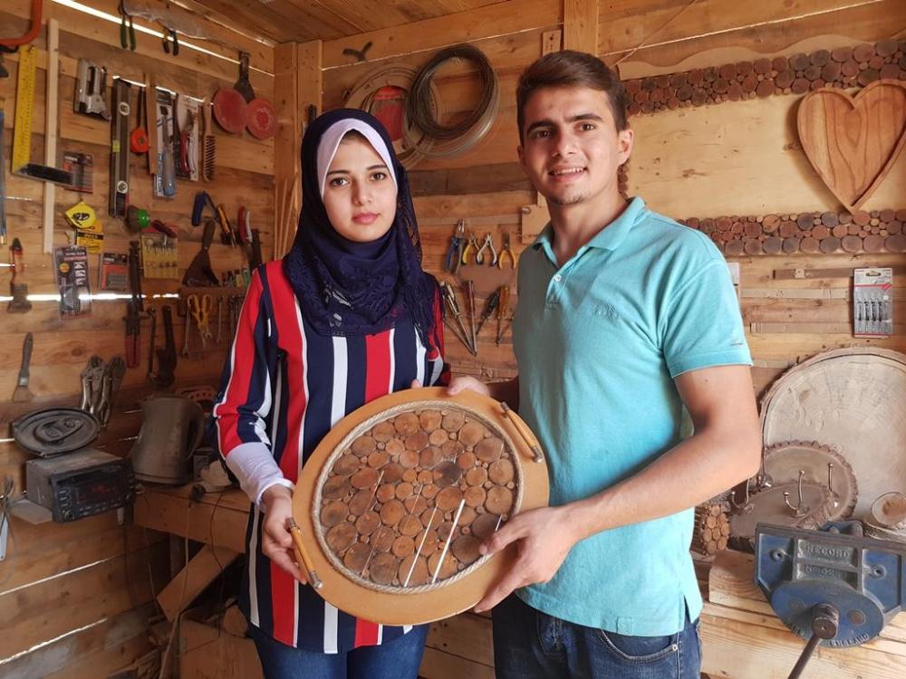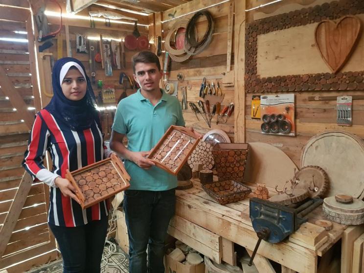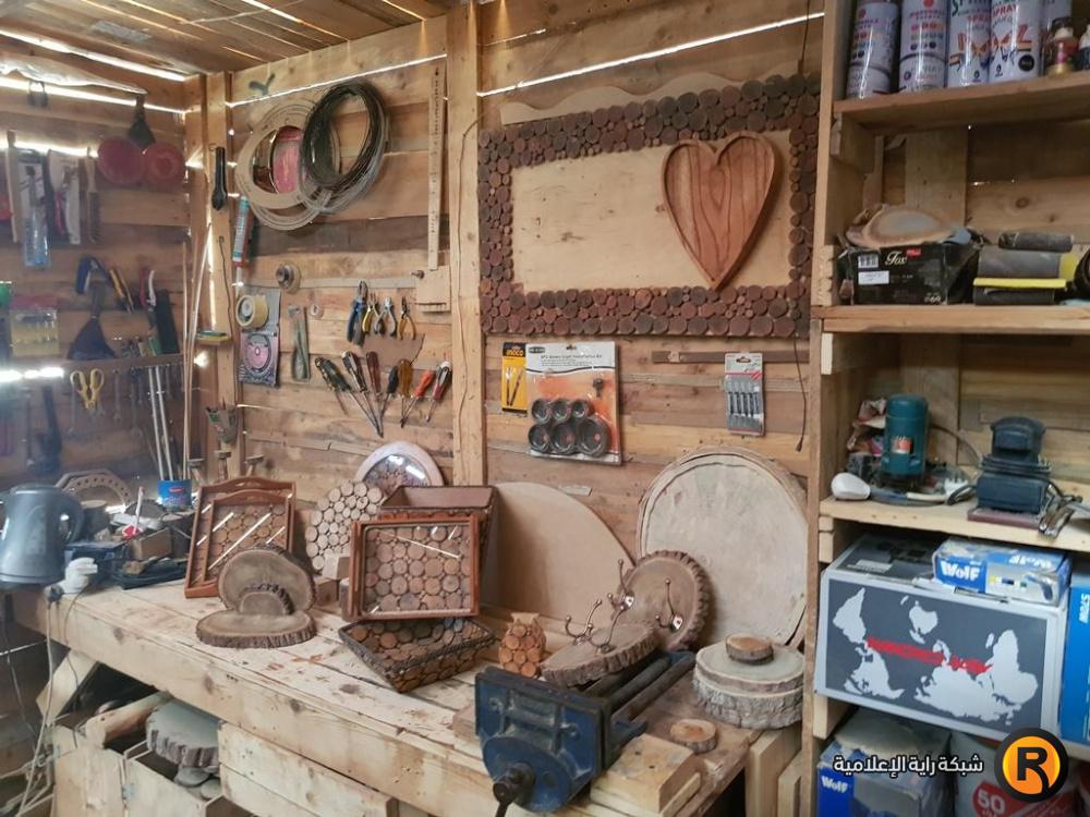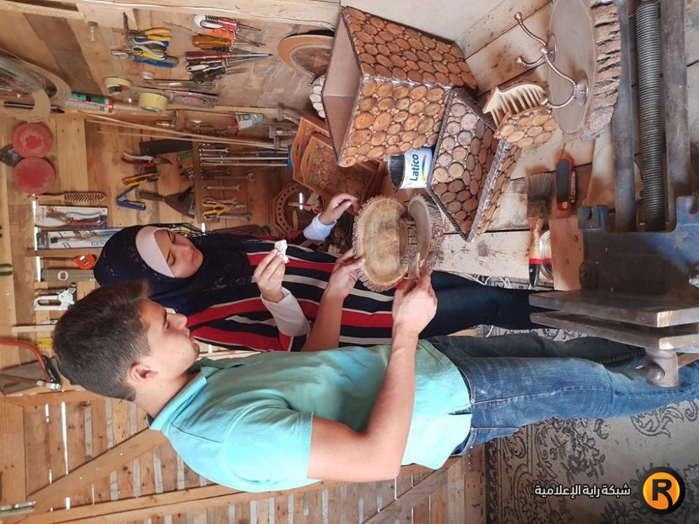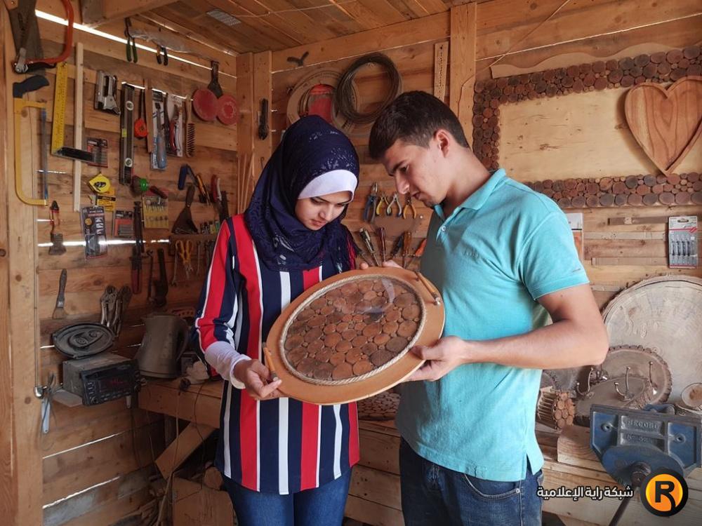 في كوخ خشبي يعج بكافة أنواع الأدوات والأخشاب، يقضيا الشقيقان هبة ونضال النخالة وقتا طويلا فوق منزلهما؛ في صناعة الأشكال الخشبية الأنيقة المتنوعة، والمصنوعة من عبق الطبيعة الخلابة، وبجودة فائقة.