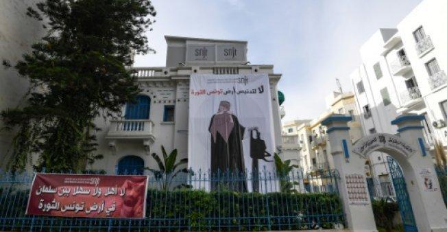ووضعت قيادة النقابة الوطنية للصحافيين التونسيين على واجهة مقرها بالعاصمة التونسية صورة عملاقة لسعودي يحمل منشارا مع عبارة "لا لتدنيس تونس أرض الثورة".