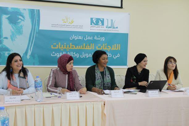 عقد الائتلاف الفلسطيني للحقوق الإقتصادية والإجتماعية والثقافية (عدالة) وبالتعاون مع مركز المرأة للإرشاد القانوني والإجتماعي ورشة عمل تحت عنوان "اللاجئات الفلسطينيات في ظلّ أزمة تمويل وكالة الغوث" صباح اليوم الثلاثاء في رام الله؛ وحضر عدد من ممثلي وممثلات المؤسسات الأهلية ومؤسسات قاعدية نسوية في المخيمات والاتحاد العام للمرأة الفلسطينية والذين لديهم اطلاع واهتمام بواقع اللاجئات في المخيمات الفلسطينية. وهدفت الورشة إلى تسليط الضوء على واقع اللاجئات الفلسطينيات واللواتي يتلقيّن خدمات أساسية من وكالة الغوث (الأونروا) داخل المخيمات وكيف تأثّرن بتقليص الخدمات مع مرور الوقت، وكيف سيتأثرّن بشكل كبير عقب وقف التمويل الأمريكي للوكالة حيث يقع عليهنّ جل العواقب في حالة وقف الاونروا عن عملها.