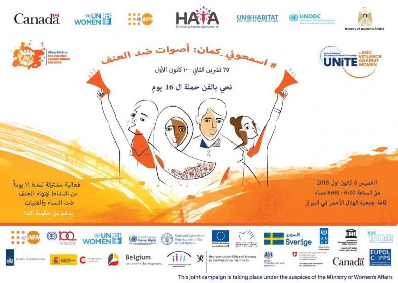 بمناسبة حملة ال 16 يوماً لمناهضة العنف ضد المرأة ، نظّم اليوم مكتب الممثلية الكندية لدى السلطة الفلسطينية وهيئة الأمم المتحدة للمرأة في فلسطين إحتفالية ضمت عدداً من النساء الناجيات من العنف، إضافة إلى الفنان بشار مراد ، وفرقة الهيب هوب دام DAM ، وذلك من خلال البرنامج المشترك (حياة: القضاء على العنف ضد المرأة) الممول من حكومة كندا والذي تم إطلاقه في نيسان من هذا العام.