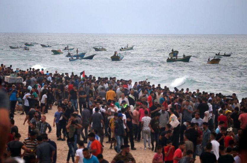 وتوافد المئات الى الحدود البحرية الشمالية للمشاركة في المسير البحري للمطالبة برفع الحصار وانهاء معاناة المواطنين.