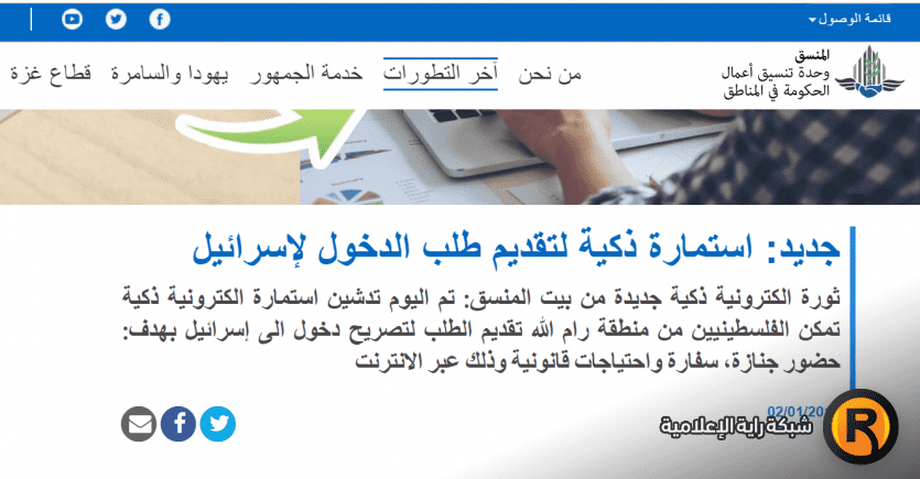 وأعلنت أمس صفحة ما يسمى بـ "المنسق" التابعة لجيش الاحتلال عن تقديم خدمات الكترونية في عملية تقديم التصاريح للمواطنين الفلسطينيين دون الحاجة للذهاب الى مكاتبه – بيت ايل- لتقديم التصاريح أو ما تسمى بـ"الادارة المدنية" في منطقة رام الله والبيرة في إشارة غير مباشرة الى تشجيع التعامل المباشر معها، في محاولة وصفها البعض تهدف الى إلغاء دور وزارة الشؤون المدنية الفلسطينية الجهة الرسمية التي تقوم بمتابعة الطلبات الفلسطينية مع الاحتلال، وهذا ما لوحظ مؤخرا من توغل للاحتلال و"إدارته المدنية" في التواصل مع الجمهور الفلسطيني من خلال مواقع التواصل الاجتماعي المختلفة.