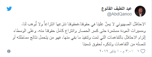 وقال المتحدث باسم حركة حماس عبد اللطيف القانوع في تغريدة عبر "تويتر" إن "الاحتلال لا يمنّ علينا في حقوقنا، فحقوقنا ننزعها انتزاعاً ولا تُوهب لنا".
