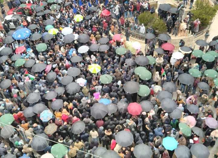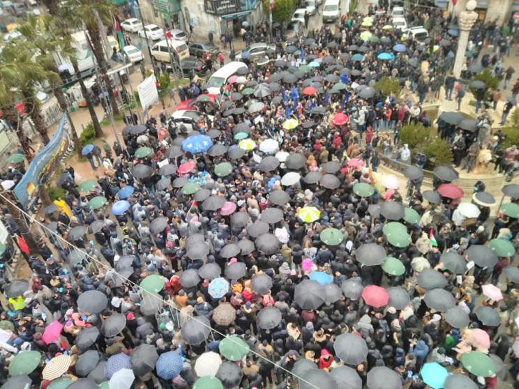 تظاهر الآلاف من موظفي القطاع الخاص والعمال، رغم الامطار والاجواء الباردة، على دوار المنارة وسط مدينة رام الله، ضد قرار الحكومة بتطبيق قانون الضمان الاجتماعي.