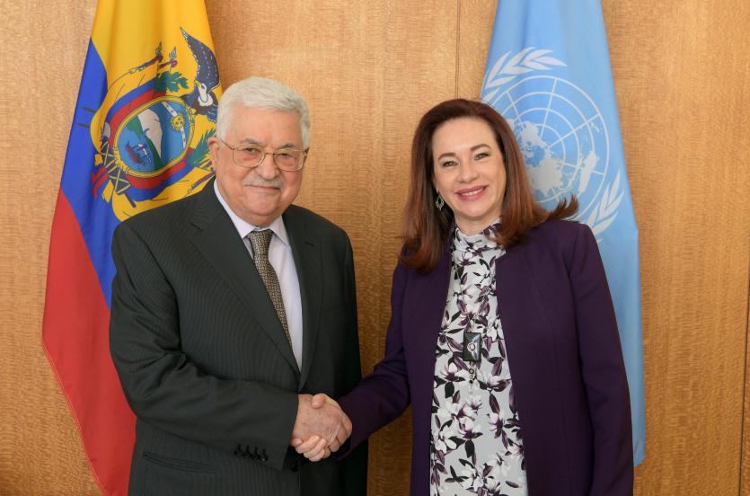التقى الرئيس محمود عباس، اليوم الاثنين، في نيويورك، رئيسة الجمعية العامة للأمم المتحدة ماريا فرناندا إسبينوزا.