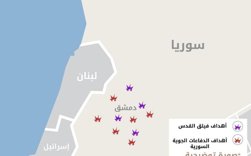 ويبدو في الخريطة، استهداف عشرة مواقع في محيط دمشق، منها أربعة مواقع تابعة لفيلق "القدس" الإيراني، وستة مواقع تابعة للدفاع الجوي السوري، الذي أطلق عشرات المضادات من اجل اعتراض الصواريخ والطائرات الإسرائيلية الليلة الماضية.