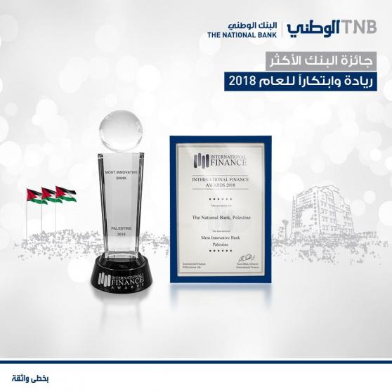 تقديرا لجهوده في إدخال التكنولوجيا الرقمية إلى السوق المصرفي الفلسطيني بإطلاقه لأول مركز خدمات مصرفية رقمي من نوعه بين بنوك الشرق الأوسط، وإيجاده لحلول مبتكرة لمواصلة نموه وتطوره، كرمت مجلة International Finance العالمية البنك الوطني بمنحه جائزة "البنك الأكثر ابتكارا وريادة في فلسطين" وذلك خلال حفل لتوزيع الجوائز أقيم في دبي ضم العديد من رجال الأعمال ومدراء البنوك في الشرق الأوسط وآسيا وإفريقيا.