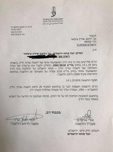 أصدرت سلطات الاحتلال اليوم الثلاثاء، قراراً بمنع الأسيرة المحررة شيرين طارق العيساوي من ممارسة مهنة المحاماة مدى الحياة.