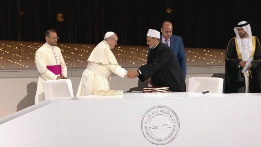 وقع بابا الكنيسة الكاثوليكية، البابا فرنسيس، وشيخ الأزهر، الإمام الأكبر أحمد الطيب، مساء اليوم، وثيقة "الأخوة الإنسانية" في العاصمة الإماراتية أبوظبي، خلال فعاليات لقاء الأخوة الإنسانية الذي احتضنه "صرح زايد المؤسس".