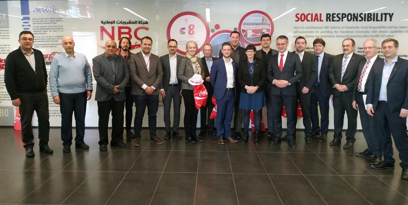 زار وفد برلماني ألماني رفيع المستوى يرافقه عميد برنامج الدراسات الثنائية في جامعة القدس د. صلاح الدين عودة مصنع شركة المشروبات الوطنية كوكاكولا/كابي ومقرّها الرئيس في رام الله، من أجل الإطلاع الميداني على تدريب طلبة برنامج الدراسات الثنائية في جامعة القدس، وللوقوف على سير الشراكة بين الحكومة الألمانية وجامعة القدس، وشركات القطاع الخاص الفلسطيني.