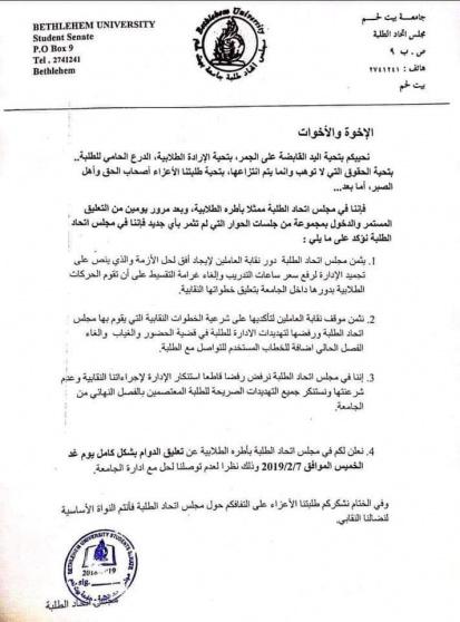 وذكر رئيس مجلس إتحاد الطلبة صبح "نحن مستمرين في خطواتنا النقابية حتى نيل المطالب، وجامعة بيت لحم لما بدأنا خطواتنا، وجهت انذارا وتهديدا بالفصل لكل من رئيس المجلس ونائب الرئيس وسكرتير المجلس وسكرتير المالية، بالإضافة يوم أمس بعد مباحثات المقترح بأن نأخذ من ميزانية المجلس للتمريض دون الحديث بالتربية وجهت تهديدا صريحا لسكرتير ورئيس ونائب الرئيس واللجنة المالية، فنحن نعمل مع الجامعة كشريك وبالمقابل يعاملونا كعدو".