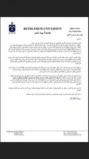 مؤخرًا نشرت إدارة جامعة بيت لحم بيانًا تعلن فيه تعليق الدراسة حتى تثق في إمكانيتها تقديم البرامج الدراسية دون انقطاع، مشيرةً أن تعليق الدوام سيكون دون تواجد الطلبة في الجامعة، وأنها مستمرة حتى يصدر بيان بوقفه.