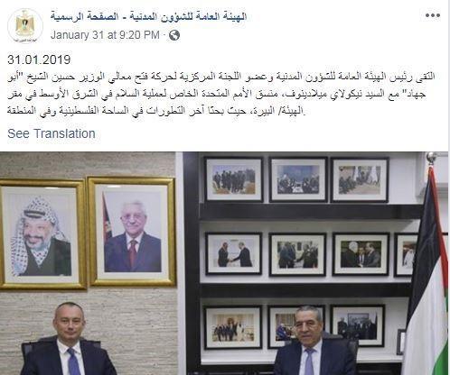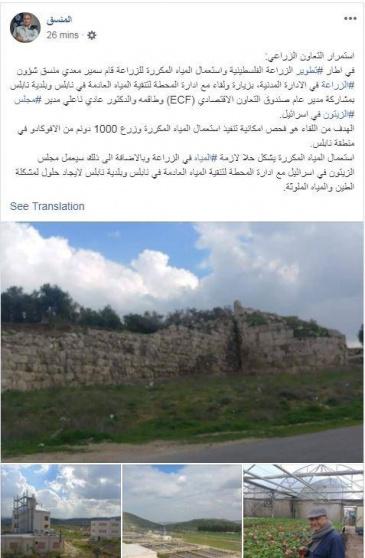 في آخر منشورات الصفحة جاء التالي: "في اطار تطوير الزراعة الفلسطينية واستعمال المياه المكررة للزراعة قام سمير معدي منسق شؤون الزراعة في الادارة المدنية، بزيارة ولقاء مع ادارة المحطة لتنقية المياه العادمة في نابلس وبلدية نابلس بمشاركة مدير عام صندوق التعاون الاقتصادي (ECF) وطاقمه والدكتور عادي ناعلي مدير مجلس الزيتون في اسرائيل".