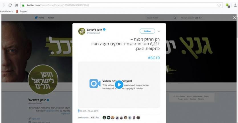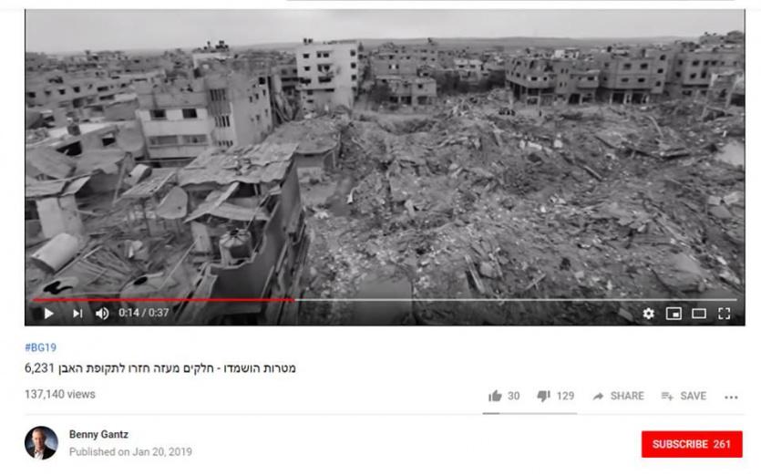 أوقف موقع التواصل الاجتماعي "تويتر" وموقع "يوتيوب" المتخصص بالفيديو، الدعاية الانتخابية لرئيس هيئة أركان الجيش الإسرائيلي السابق بيني غانتس والتي استخدمت صورا جوية لدمار غزة عام 2014.