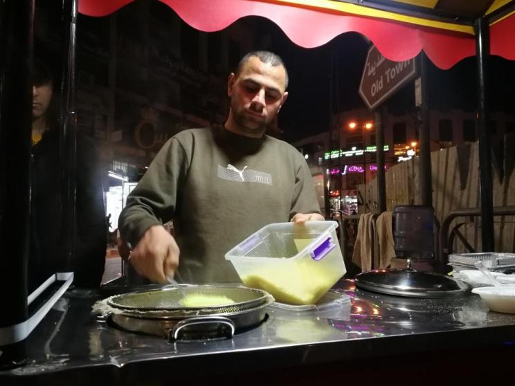 على منارة الخليل، تصطف عربة صغيرة، على هيئة مركبة أمريكية الطراز، فيها قدر متوسط الحجم، وهو بمثابة خزان وقود، لكن ذلك الوقود ليس للمركبة وإنما للمارة الذين يحاول الشاب العشريني نور الجولاني استقطابهم عبر نداءاته"على المبسبس، على الكنايف يا سخن، مبسبس مبسبس".