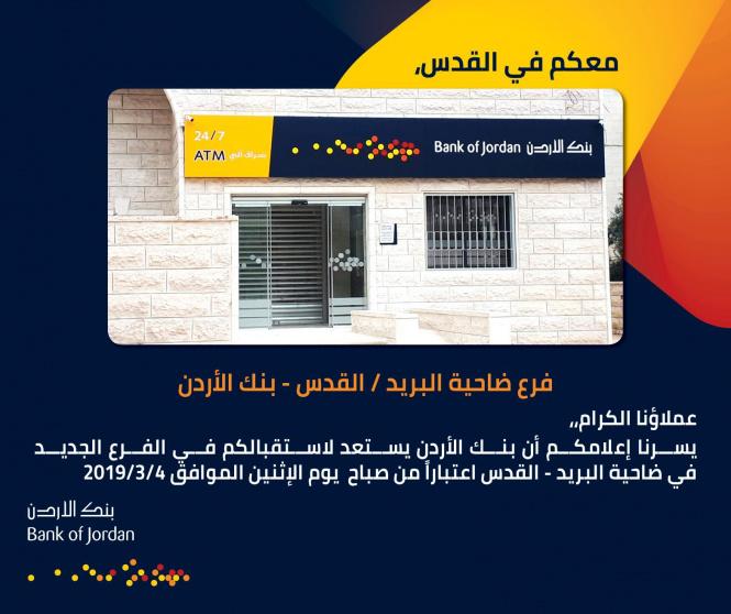 توج بنك الأردن رسميا عامين من العمل المتواصل والدؤوب والجهود الحثيثة لمواجهة العقبات وذلك بافتتاح فرعه في مدينة القدس الشريف يوم الاثنين الموافق 4/3/2019، حيث يقع الفرع الجديد في شارع الياسمين ضمن ضاحية البريد شمال مدينة القدس.