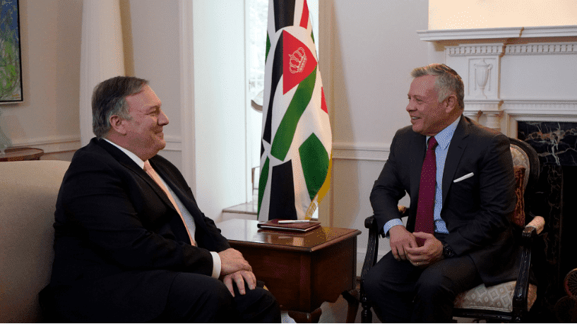 قال مصدر أمريكي مطلع إن وزير الخارجية مايك بومبيو ومستشاري البيت الأبيض جاريد كوشنر وجيسون جرينبلات بحثا فرص السلام بالشرق الأوسط مع عاهل الأردن الملك عبد الله في واشنطن يوم الاثنين.