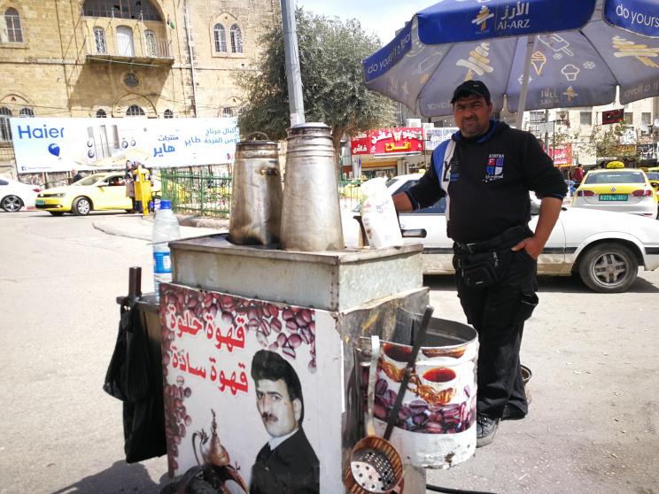 السعيد كان يحملُ (الدلّة) كل صباح حتى آخر الليل بصورة يومية ليبيع القهوة ويجمع قوت أطفاله، لكنه بالسنوات الثلاث الأخيرة ركن الى احدى الأرصفة في منطقة باب الزاوية وسط الخليل على عربة صغيرة كونه يعاني من عجز بقدمه التي منعته من القدرة على التجوّل بالشوارع كما السابق.