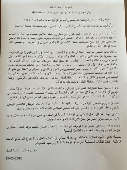 مجلس عشائر الخليل يصدر بيانًا حول قمع حماس للحراك الشعبي في غزة