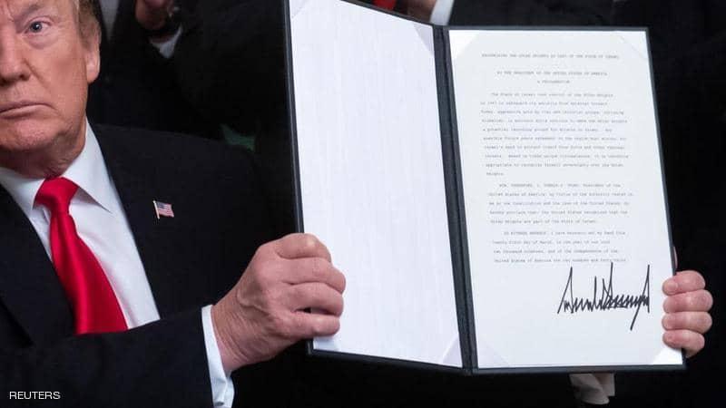 وكان ترامب وقع، خلال مؤتمر صحفي مشترك مع رئيس الوزراء الإسرائيلي، بنيامين نتانياهو، اعلانا يعترف بسيادة إسرائيل على هضبة الجولان السورية التي احتلتها اسرائيل عام 1967 وضمتها العام 1981.