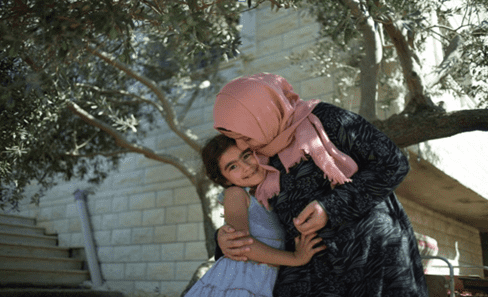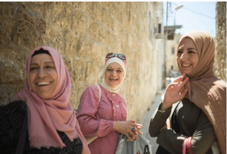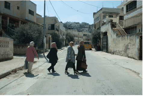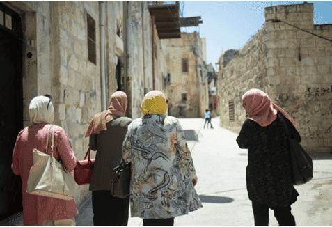 تظهر فاطمة وزملائها وهم في زيارة منزل اَخر في مدينة جنين – منطقة السوّاد في الحارة القديمة.