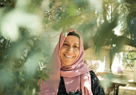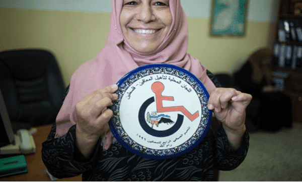 فاطمة امرأة فلسطينية تعمل في مركز إعادة التأهيل المجتمعي - برنامج الحق المبني على المجتمع والمختص بالدفاع عن حقوق الأشخاص ذوي الإعاقة في شمال الضفة الغربية.