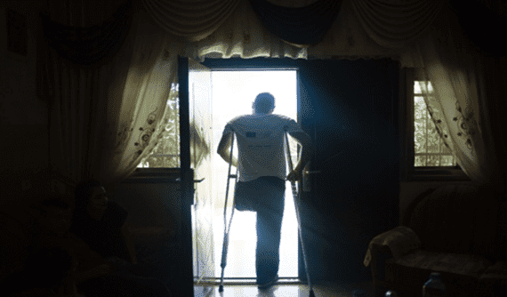 أنور وهو زوج فاطمة عند مدخل منزلهم، يعمل أنور كمناصر لحقوق الإنسان الخاصة بأشخاص ذوي الإعاقة