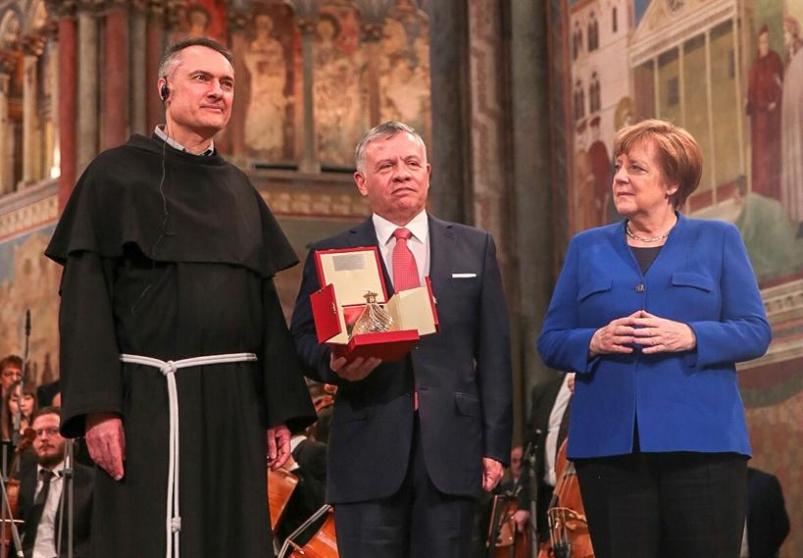 وتسلّم العاهل الأردني الجائرة من حارس دير أسيزي الكاهن الفرنسيسكاني ماورو غامبيتي، بحضور عدد كبير من الشخصيات المدنية والدينية، بينها رئيس مجمع الكنائس الشرقية الكاردينال ليوناردو ساندري، ورئيس مجلس أساقفة إيطاليا الكاردينال غوالتييرو باسيتي، والمستشارة الألمانية انجيلا ميركل، ورئيس الوزراء الإيطالي جوزيبي كونتي.