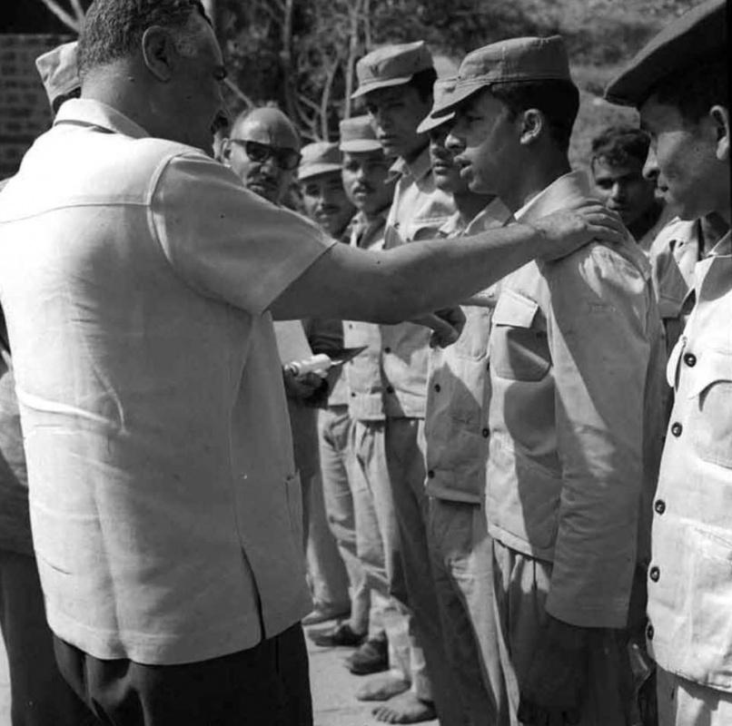 ومن بين الصور التي نشرتها الصفحة، لقاء الزعيم الراحل مع الرئيس المصري الأسبق محمد حسني مبارك، حيث يظهر في الصورة وهو يصافحه، وكان مبارك برتبة عقيد.