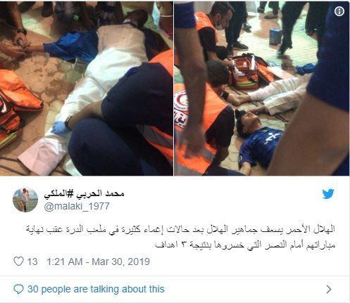 ومع نهاية المباراة لم يتحمل عدد من جماهير الهلال، ضياع الصدارة من فريقهم في لحظات، فأغمي عليهم.