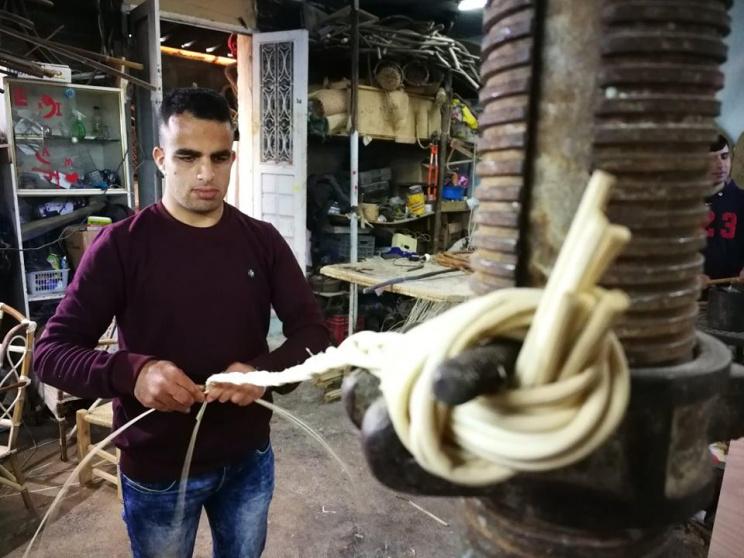 في ورشة متواضعة، تعجّ بعصيّ الخيزران وحباله، يقف الكفيف محمد أبو داود "22 عاما"، يتحرك بحرية في مساحة يدرك تفاصيلها كما لو يراها، يربط طرف حبال الخيزران في ماسورة حديدية، ثم يبدأ بجدلها بين أصابع يديه بسرعة واتقان كبيرين، قبل أن يدفع بها إلى زملائه ليجدل أخرى.