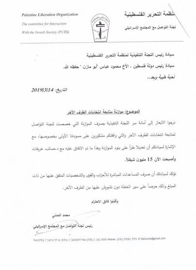 الوثيقة التي جرى تداولها عبر مواقع التواصل حول طلب اللجنة مبلغ مالي لمتابعة الانتخابات الإسرائيلية